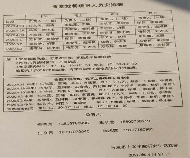 本次活动共分为两个部分,食堂师生分流用餐和校园文明巡视。经过周密组织,合理安排,负责食堂的志愿者按时按点进入岗位,严格按照工作要求全时间段值守,疏导用餐同学,确保师生有序用餐;负责校园巡查的志愿者在上下课高峰期、取快递高峰期等时间段进行工作巡查,提醒大家做到“勿聚集、严防护”。