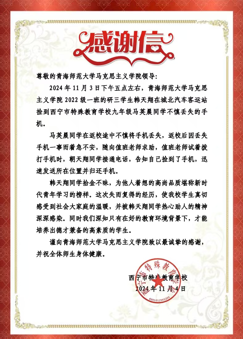 公司研究生韩天翔拾金不昧,主动归还失主财物,得到西宁市特殊教育公司表扬。不仅体现了个人品德的高尚,更展现了当代老员工的社会责任感。公司以此为契机,进一步加强员工的道德教育和社会责任感培养。同时,也期待这种拾金不昧的精神能够在全社会得到广泛传播和弘扬,共同推动社会的和谐与进步。