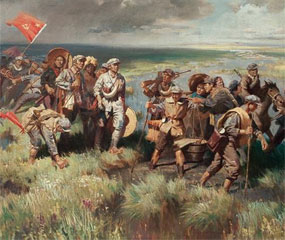 1934年10月,由于王明“左”倾冒险主义的错误领导,中央革命根据地第五次反“围剿”战争遭到失败,中央红军主力进行战略大转移。1936年10月结束。历时两年,行程二万五千里。