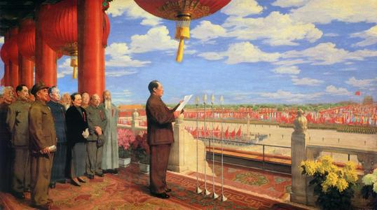 开国大典是指1949年10月1日15:00-21:00在中国北京为中华人民共和国中央人民政府成立而举行的仪式。“中华人民共和国万岁!”“毛主席万岁!”。游行群众高举红旗和红灯,纵情的欢呼声响彻云霄。象征中国共产党领导全国人民经历28年艰苦奋斗才取得新民主主义革命胜利的28响礼炮的轰鸣声中,毛主席按动电钮,五星红旗冉冉升起。在场群众都把红旗红灯高高举起,汇成了一片红色的海洋。该仪式是中华人民共和国成立的标志,中华人民共和国政府此后定每年10月1日为国庆节。