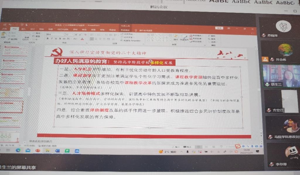 铁生兰教授以“发展”为切入点,结合工作实际,从“教育是国之大计、党之大计”“办好人民满意的教育”“以人民为中心发展教育,促进教育公平”“推进教育的数字化 建设全民终身学习学习型社会 ”等内容进行了详细解读,主题鲜明,重点突出,讲解清晰,加深了师生对二十大精神的深刻理解。