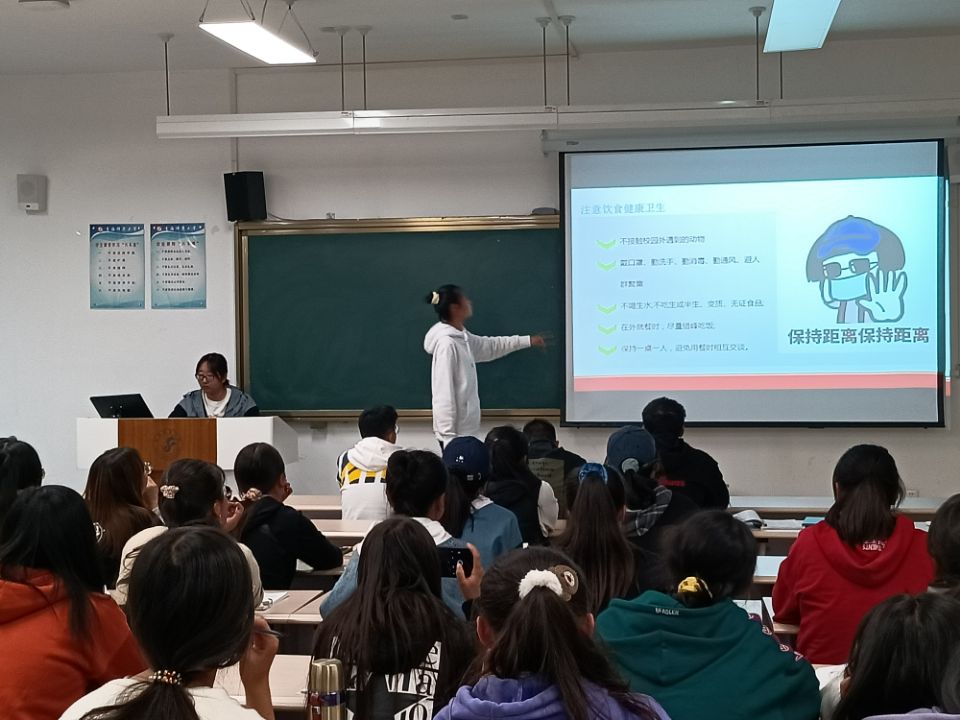 首先,由马雨新同学向同学们一是介绍了“四史”为党史、新中国史、改革开放史、社会主义发展史,“四史”各有侧重,自成系统;二是观看相关影片和进行知识问答的方式进行对新冠病毒常态防御进行宣传。