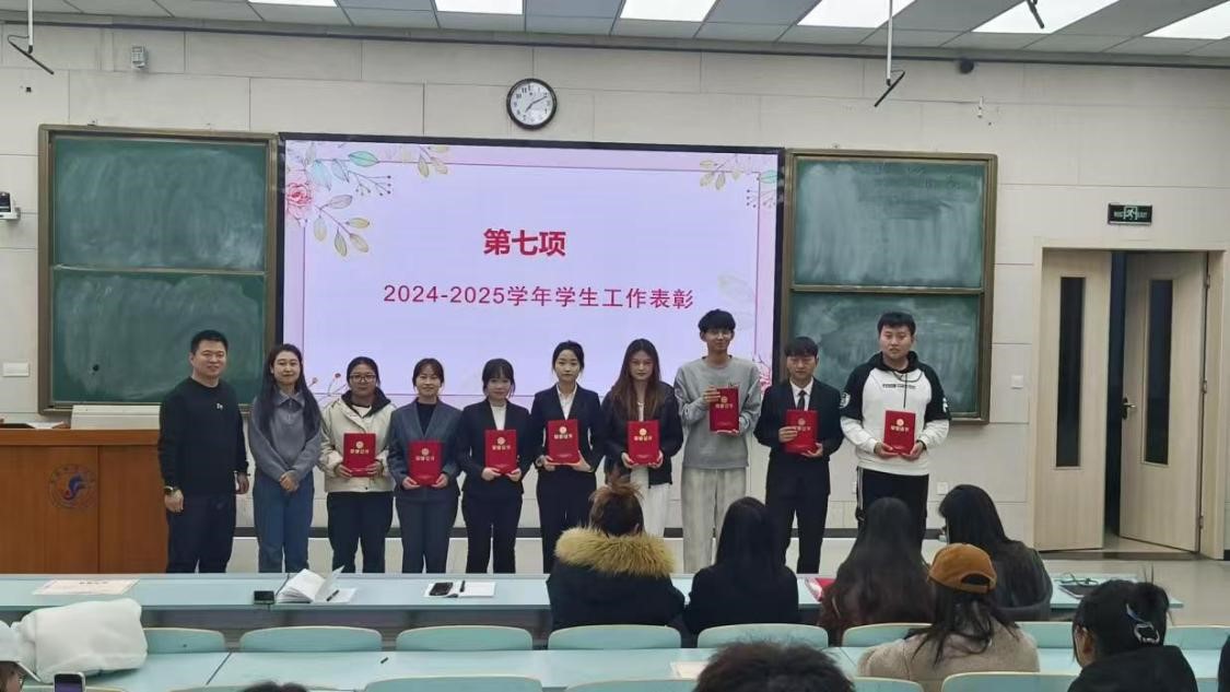 会议第三项进行表彰活动。辅导员张老师和陈老师为2024年度优秀员工干部、共青团干部等颁发奖状,为新旧两届员工会干部颁发聘书及荣誉证书。辅导员陈晨、张训萌对上一届员工会的工作表示充分肯定,并对新一届干部提出了殷切期望,希望大家牢记服务同学宗旨,勇于创新,敢于担当,团结协作。
